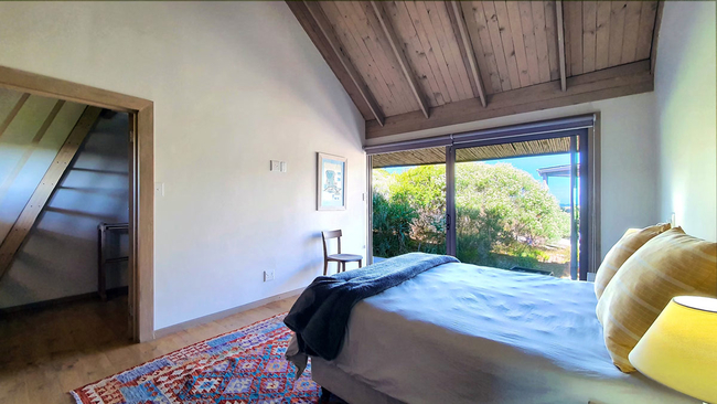 From the living area, doors open onto a spacious balcony furnished with outdoor seating and a braai area, where guests can enjoy the tranquil surroundings and fresh coastal air. Secure parking is provided, and the villa is only a short walk from a secluded beach, perfect for quiet strolls or sunset views.