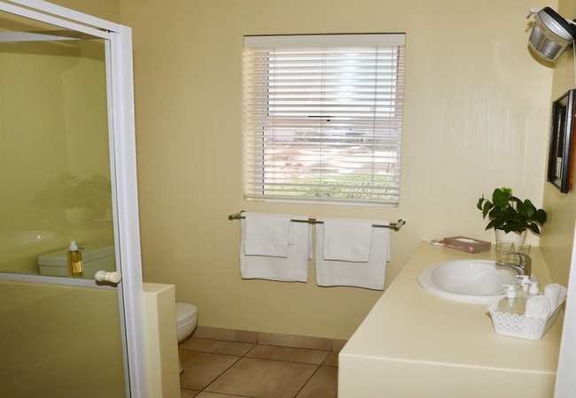 The ground floor apartment has one bedroom furnished with a Queen-size bed and an en-suite bathroom with a shower. Bed linen and towels are provided. There is an open plan, comfortably furnished lounge which leads out onto a spacious patio with braai facilities and gorgeous views. The kitchen is well equipped for self-catering and includes a dishwasher.
