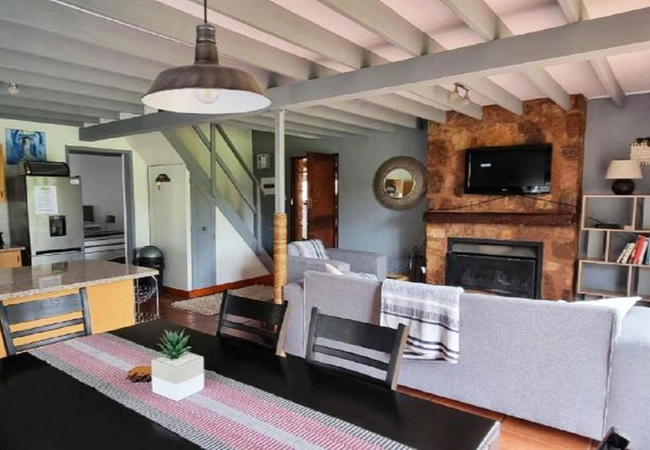 The kitchen is fully equipped for self-catering with a gas stove, oven, microwave, kettle, fridge and toaster. The dining area contains a dining table and chairs. The lounge has comfortable furniture, a fireplace, and a TV with full DStv.