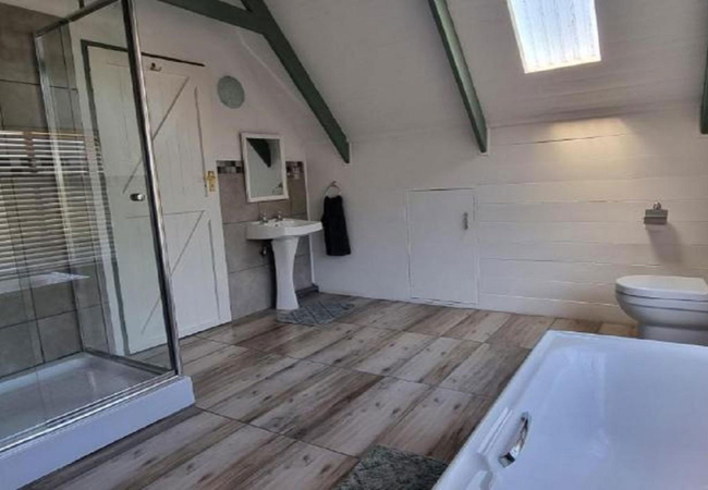 The first bedroom is located upstairs and is furnished with two single beds. The en-suite bathroom is fitted with a bath, shower, toilet and basin. The second bedroom is downstairs and is furnished with a double bed. The en-suite bathroom is fitted with a bath, shower, toilet and basin.