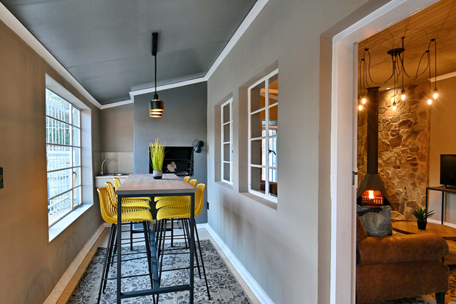 This charming 3-bedroom farmhouse offers a comfortable and inviting stay with versatile sleeping arrangements, including one bedroom with a king-size bed that can be split into two singles, one bedroom with a double bed, and another with two single beds. The home features a bathroom equipped with a shower and vanity, along with a separate toilet for added convenience. The fully equipped kitchen includes a gas stove and a pantry, perfect for preparing home-cooked meals. The cozy lounge area boasts a fireplace and TV, creating a warm space to relax. An enclosed indoor patio features a built-in braai and a table with six chairs, ideal for entertaining. Additionally, the outdoor patio includes a six-seater patio set and a fireplace that can also be used as a braai, offering a perfect setting for al fresco dining or gathering under the stars.
