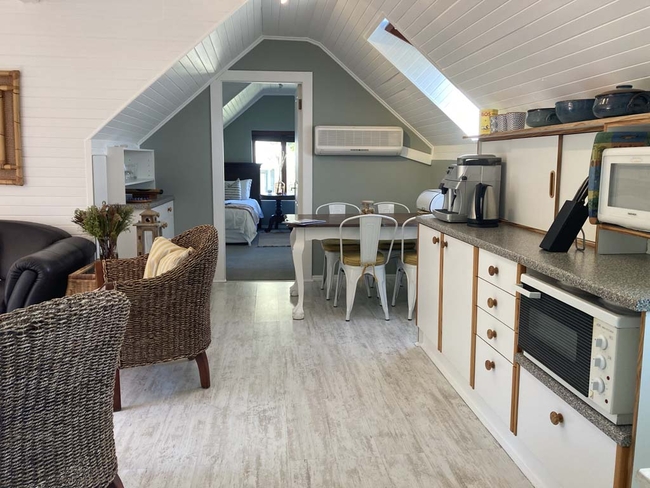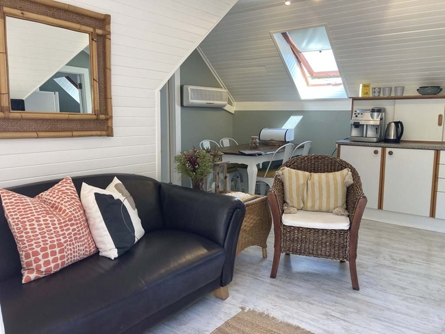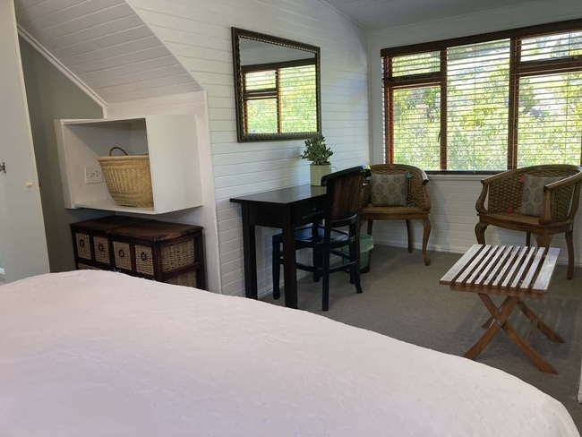 Separate and self-contained. Lovely bedroom with a king size bed (2 twin beds) and en-suite bathroom with bath and shower, a separate lounge/dining area and a kitchenette. The lounge has sliding doors out onto a wooden deck with weber barbecue. Air conditioned.