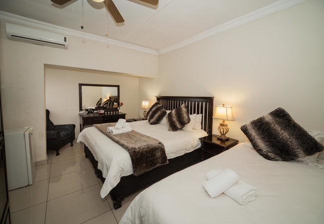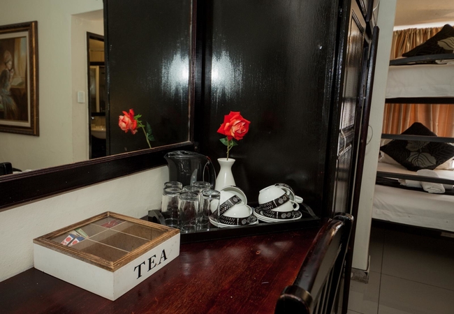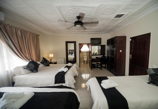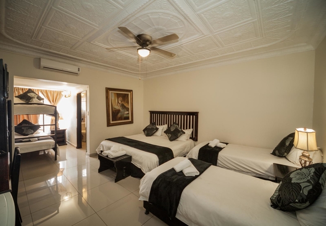The Family rooms are furnished with a queen-size bed and a three-quarter bed and have an en-suite bathroom. All rooms have a flatscreen TV with SABC channels, tea / coffee making facilities, air conditioning and a bar fridge.