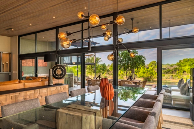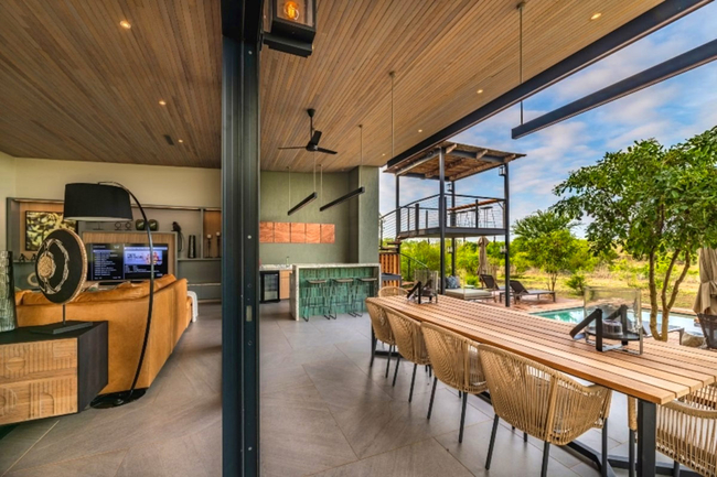 Perched on the serene banks of the Sabi River, Dzombo Lodge at Elephant Point offers breathtaking views of the untouched wilderness of the Kruger National Park. Designed for ultimate relaxation, this fully air-conditioned villa is ideal for a private retreat, boasting an expansive front wooden deck and a luxurious heated swimming pool. This villa comfortably accommodates up to eight guests and features four well-appointed, air-conditioned bedrooms, each with an en-suite bathroom. Two of the bedrooms are fitted with king-size beds, while the remaining two offer twin beds. The en-suite bathrooms are equipped with a shower, bathtub, washbasin, and toilet. Guests are provided with premium linens, plush towels, and quality toiletries. The open-plan living area combines style and functionality, offering a modern kitchen equipped with a gas stove, electric oven, microwave, fridge-freezer, coffee station, and a full range of cutlery and crockery. A central island with seating connects seamlessly to a large dining table, where guests can enjoy shared meals. The lounge area provides comfortable seating and a flat-screen TV, with complimentary Wi-Fi available throughout the villa. This living space extends to a covered patio, complete with an outdoor dining table, a cozy lounge area, and braai facilities. Steps from the patio lead to a wooden deck featuring a heated swimming pool, sun loungers, and a sunken boma – an ideal spot for gathering around the fire under the stars.