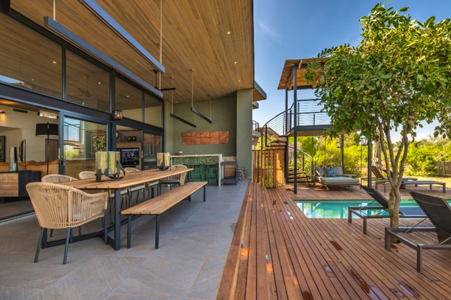 Perched on the serene banks of the Sabi River, Dzombo Lodge at Elephant Point offers breathtaking views of the untouched wilderness of the Kruger National Park. Designed for ultimate relaxation, this fully air-conditioned villa is ideal for a private retreat, boasting an expansive front wooden deck and a luxurious heated swimming pool.