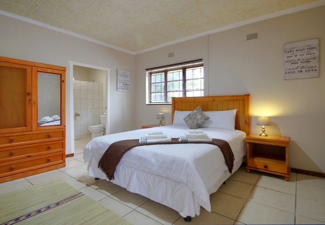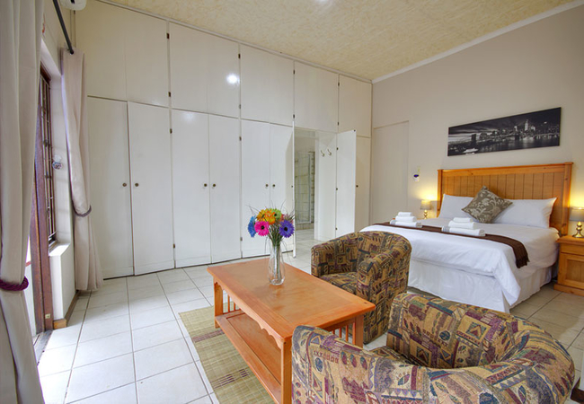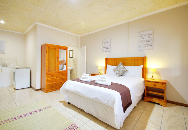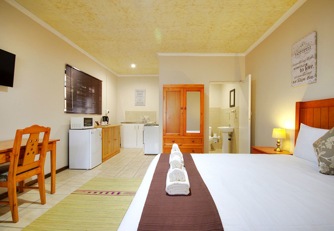 The Deluxe Queen Room is furnished with a Queen size bed. The en-suite bathroom has a shower. The room has a TV with DSTV (Hotel Bouquet), microwave, fridge, air-conditioning, hairdryer, heater, Free WiFi, no smoking, tea and coffee facilities.
