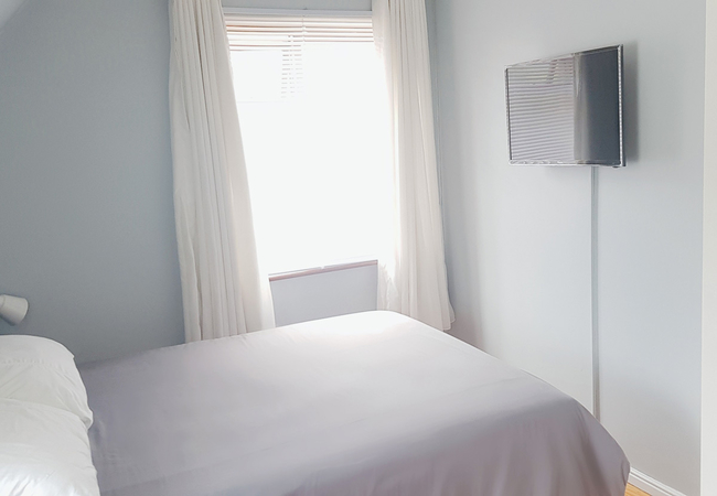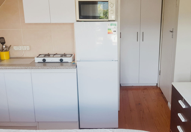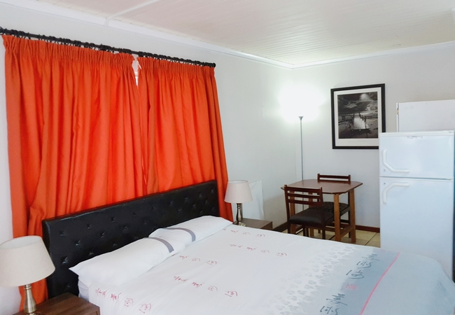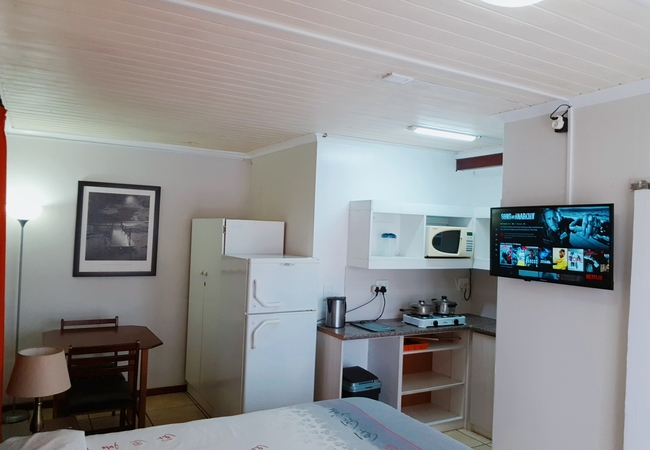 The room is situated downstairs and is furnished with a double bed and has an en-suite bathroom with a shower. There is a small fully equipped kitchenette with a one plate gas stove, mini bar fridge, crockery and cutlery. The room is equipped with free fibre Wi-Fi and an LCD TV with Netflix. Outside there is a patio with braai facilities and secure parking behind a motorised gate is provided.