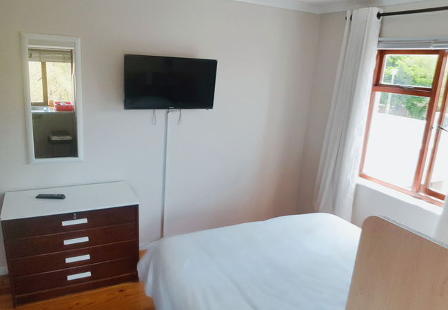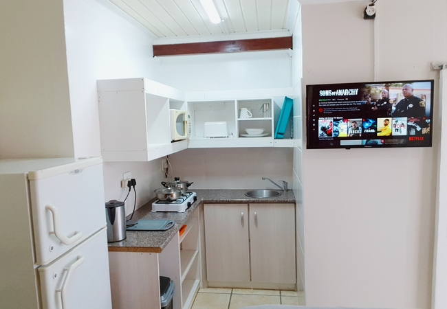 The room is upstairs and has a stunning view of Table Mountain. The room is furnished with either a double bed or two single beds and has an en-suite bathroom with a shower and a hand wash basin. There is a small fully equipped kitchenette with a one plate gas stove. The room is equipped with free fibre Wi-Fi and an LCD TV with Netflix. Secure parking behind a motorised gate is provided.