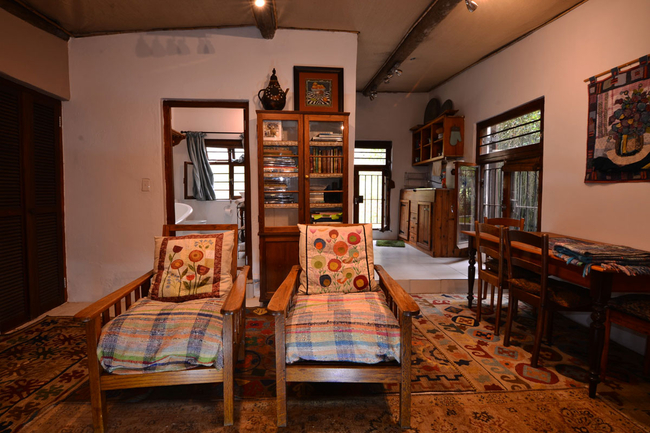 Earth Cottage has a relaxed, old-world theme. Rich wood, Persian and African carpets and other natural fabrics and textures contrast sharply with the crisp white linens and towels welcoming you. Earth Cottage has one bedroom furnished with a double bed. The bathroom is fitted with a free-standing Victorian style bath with overhead shower, toilet and basin. The kitchen is equipped with a four-burner gas stove, microwave oven, kettle, toaster, a large fridge / freezer, washing machine, coffee plungers and ample cutlery and crockery. Towels, linen and braai wood for your first fire will be ready for you. Please bring your own beach towels, mountain bikes and hiking boots. Parking is off-street. The road is tarred right up to the garden gate. A portable braai is provided on the covered front veranda. There is no television. There is free uncapped Wi-Fi.