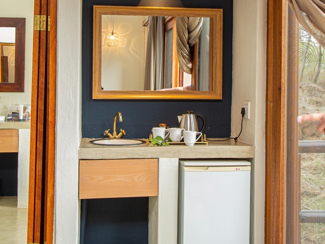 Bathrooms are appointed with generous walk-in showers and deep bathtubs positioned to take full advantage of the surrounding bushveld vistas. Inside the suite, thoughtful touches include a fireplace for chilly evenings, a ceiling fan for warm days, a well-stocked mini bar (available on request), and a tea and coffee station complete with French press, premium teas, and fresh milk.