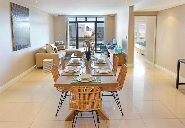 Eden On The Bay 172 Self-catering Apartment has two bedrooms (sleeps 4 guests, ideal for 2 couples or a family). The main bedroom is furnished with a extra length King-size bed and has an en-suite bathroom with a bath. The second bedroom has two single beds and a separate bathroom with a shower. The open plan apartment is beautifully furnished and decorated. The kitchen is fully equipped for self catering and includes a washing machine and dishwasher, and all the applinces and utensils you would expect to find in a well equipped kitchen. The lounge has a TV and comfortable couches and there is a six seater dining table to enjoy meals at. The living area opens onto a furnished balcony with braai facilities.