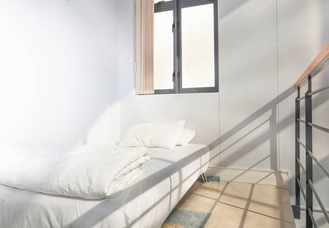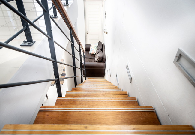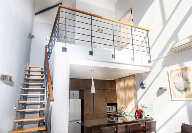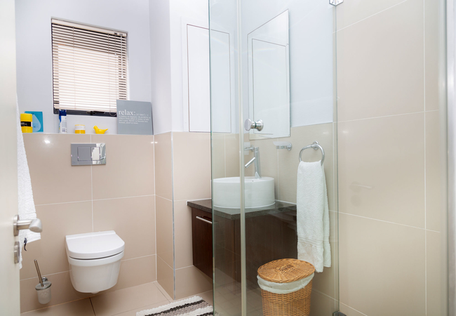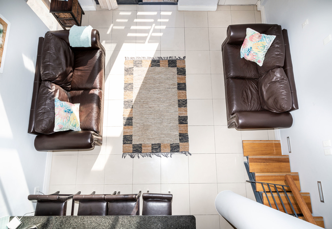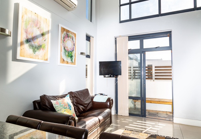 The main bedroom has a Queen-size bed, access to the balcony and an en-suite bathroom with a shower, basin and a toilet. The second bedroom has twin beds and makes use of the shared bathroom with a toilet, basin and a shower. The loft upstairs is able to sleep up to two children on a sleeper couch. Bed linen and bathroom towels are provided.