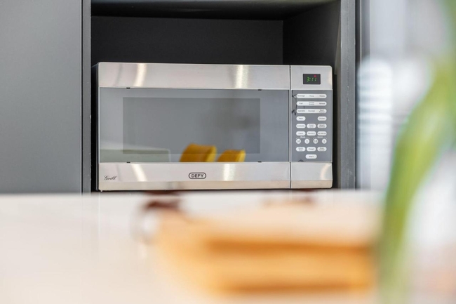 The well-appointed kitchen is equipped with all the essential modern appliances—an oven, stove, microwave, kettle, and toaster—making self-catering effortless.