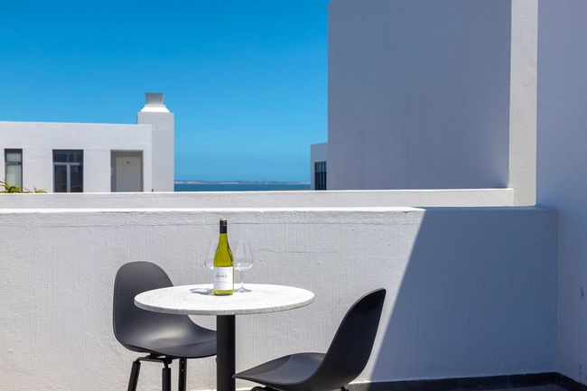 The private balcony presents breathtaking sea views and offers outdoor seating, creating an inviting space to relax with a glass of wine while enjoying the sunset over the ocean.