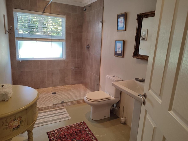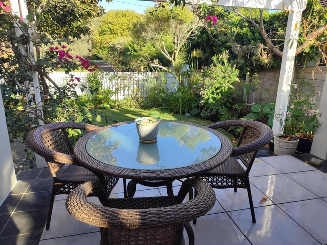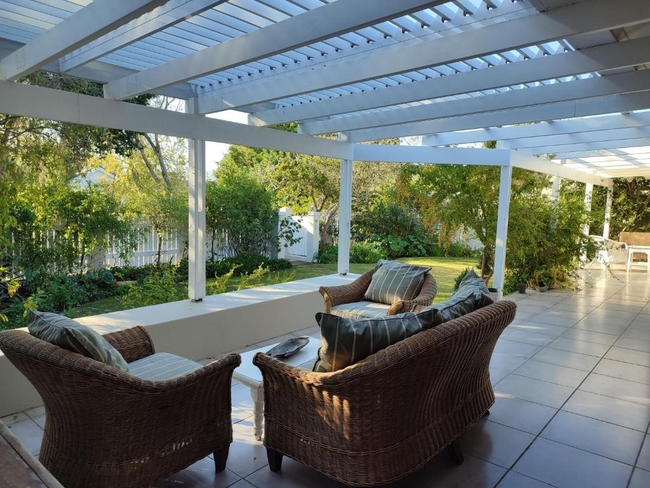 This holiday home comfortably accommodates six guests across three well-appointed bedrooms and two bathrooms, ensuring a pleasant stay with a range of modern amenities. The first bedroom offers one double bed, while the second bedroom features a large double bed. The third bedroom also includes a large double bed. Guests will appreciate the fully equipped kitchen, which is fitted with an oven, microwave, refrigerator, washing machine, and stove. The inviting lounge area offers seating and a flat-screen TV, along with Wi-Fi and Netflix for entertainment. The dining table is perfect for shared meals. Step outside onto the patio, adorned with outdoor furniture and dining areas, to soak in the tranquil garden surroundings. Braai and barbeque facilities are available, enhancing your outdoor experience.