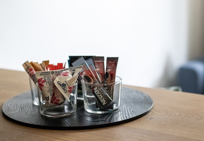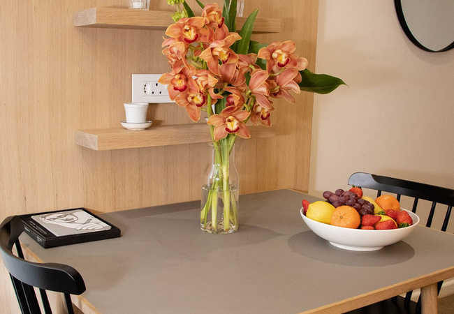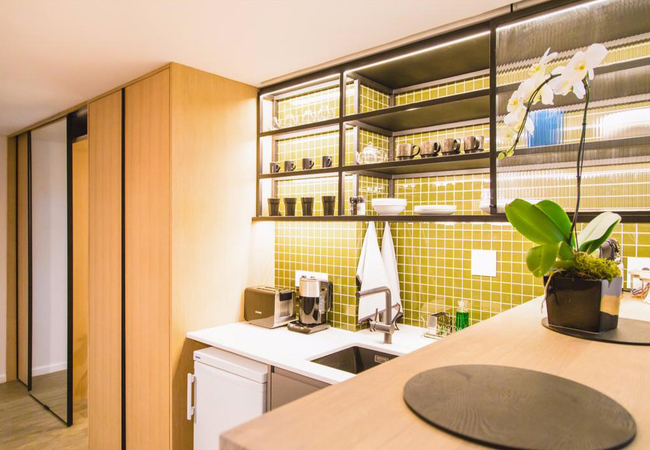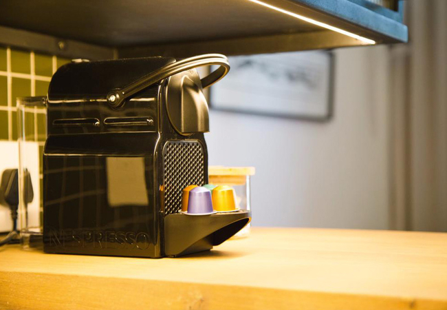 There is a small seating area and a table with chairs for dining. The kitchen has a fridge, microwave / oven combo, stove top, toaster, kettle, Nespresso machine, starter pack of coffee, tea, sugar and milk.
