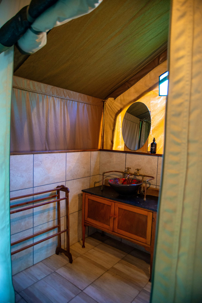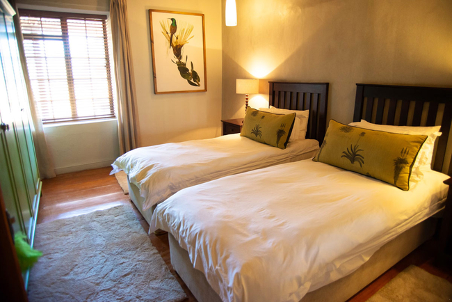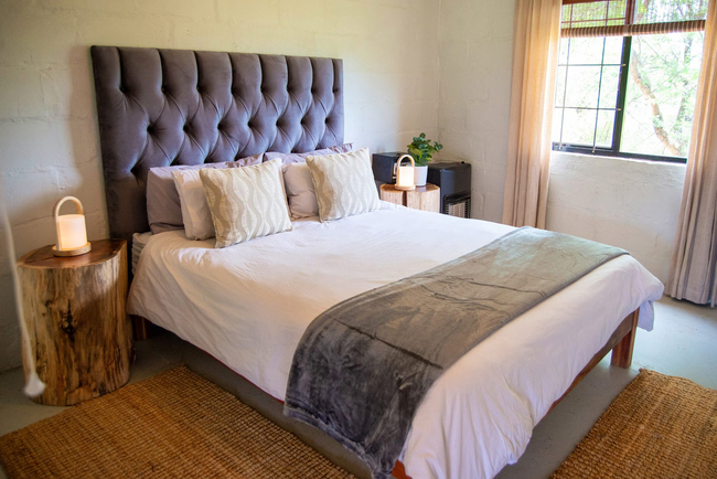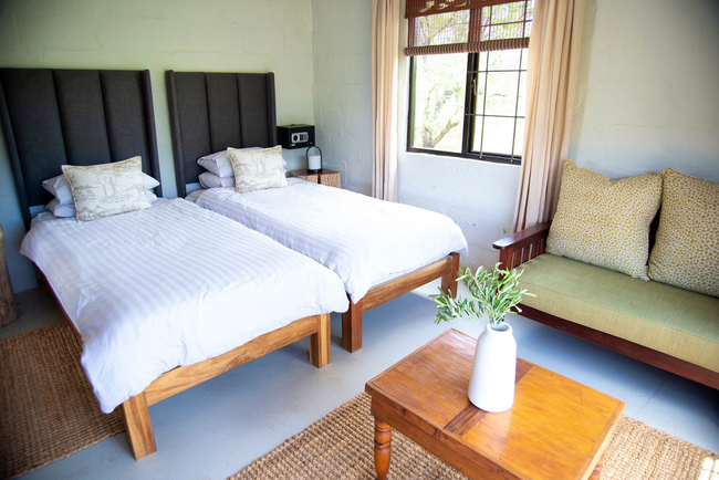 The Farmhouse, located approximately nine kilometres from the game camp, offers a quiet country retreat for up to six guests. It comprises three beautifully appointed bedrooms, each with a queen-size bed, along with two additional single beds thoughtfully arranged to suit families or small groups. The bathroom is stylishly finished with a spacious walk-in shower, twin basins, and a toilet, providing all the essentials for a comfortable and convenient stay.