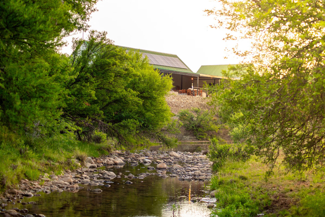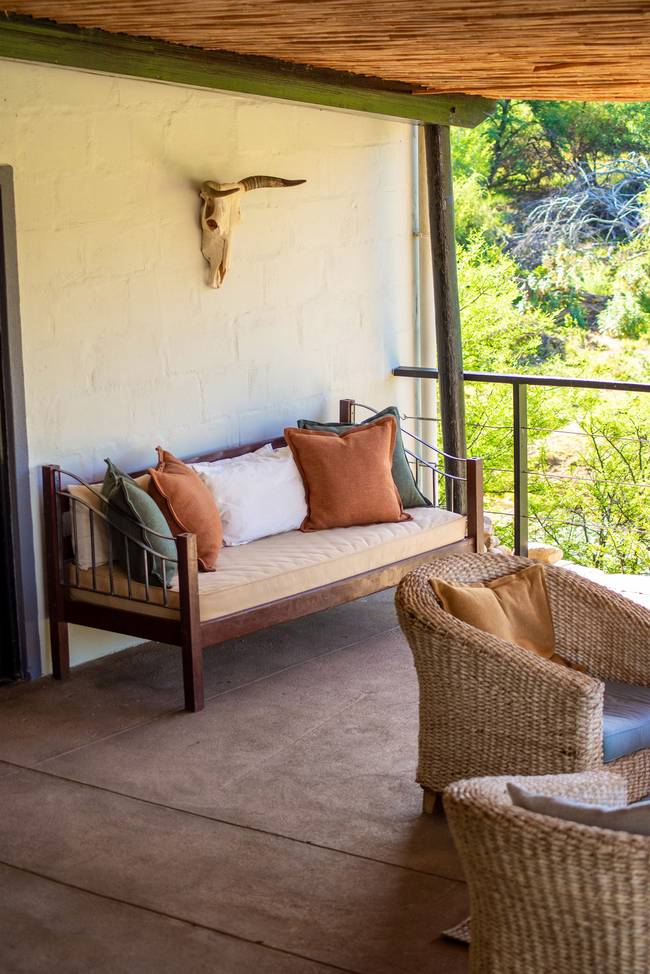 The River Lodge is tucked away within the game camp itself, providing a fully off-grid escape suited for groups of six to ten guests. The central lodge includes a generously sized bedroom with a queen-size bed, an inviting open-plan lounge and kitchen area, a charming fireplace, a dedicated bar counter, and a private bathroom fitted with a shower and toilet. Two additional bedrooms are positioned beside the main lodge, one furnished with a queen-size bed and the other with twin single beds. These rooms share a rustic outdoor shower and toilet, ideal for those wishing to embrace the essence of the bush.
