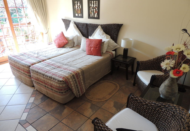 Air-conditioned with two single beds, private en-suite bathroom (bath/shower), tea/coffee making facilities, mini bar fridge, hairdryer, wall safe, bathroom amenities, outside door opening onto a small patio.