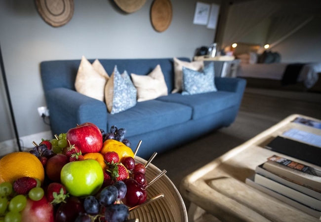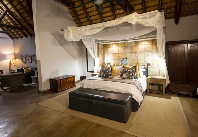 Luxury suites decorated in warm, earthy tones blend in superbly with their natural surroundings as they overlook the dry riverbed in front of the lodge. These exclusive open-plan suites each have a lounge, double bedroom, en suite bathroom (inside/outside shower) and a private sun-deck. All luxury chalets feature air-conditioning, mini bars, overhead fans, wood fires, mosquito nets and a safe. Tea and coffee making facilities are provided.