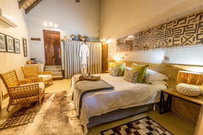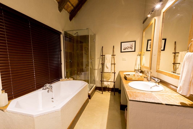 Abundant Big Five viewing is complemented by this elegant air-conditioned accommodation and superb cuisine. The two chalets back to back have an inter-leading door. There are two King-size beds that can be converted into twin beds on request. The chalet is en-suite with an indoor and outdoor shower, as well as a large bath. There is a private deck area with sweeping views of the active waterhole, or indigenous bushveld with abundant bird life. Each luxury room comes with the following features: Tea and coffee station, complementary drinking water, electric blankets, Heater/Air conditioner, ceiling fan, hairdryer. Safe, Mini fridge (not stocked), bathroom amenities, bath and pool towels, insect repellent and complimentary Wifi.
