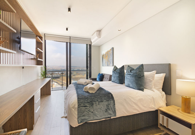Ellipse Waterfall 31015 is an air-conditioned studio apartment furnished with a double bed. The bathroom is fitted with a shower, toilet and basin. Bathrobes, linen and bath towels are provided. The kitchen is well equipped for a self-catering stay and includes a fridge, oven, microwave and kettle. Cutlery, crockery and glassware are also provided. The lounge area is comfortably furnished and equipped with a TV, Netflix and Showmax. Wi-Fi is also provided. The unit opens to a balcony.