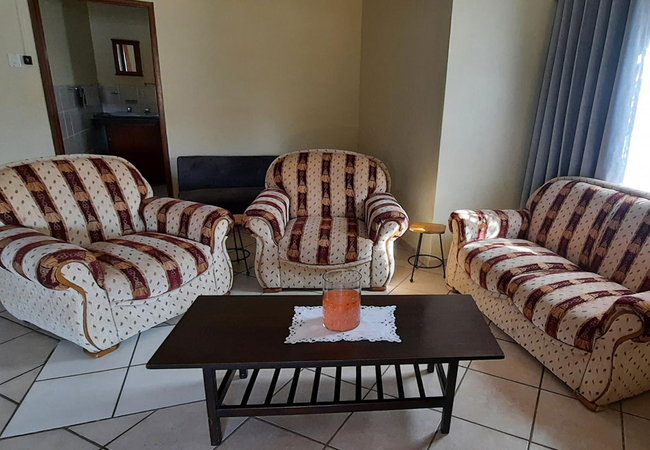 This Family Chalet has two bedrooms. One bedroom is furnished with a Queen-size bed and the other has two single beds. There is also a sleeper couch in the living area for a child. The bathroom is fitted with a shower, toilet and basin. Bring your own swimming towels. The kitchen is fully equipped for self catering and outside is secure parking and braai facilities.