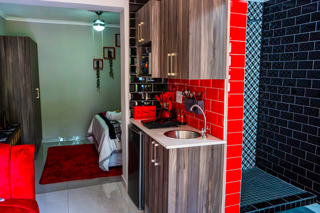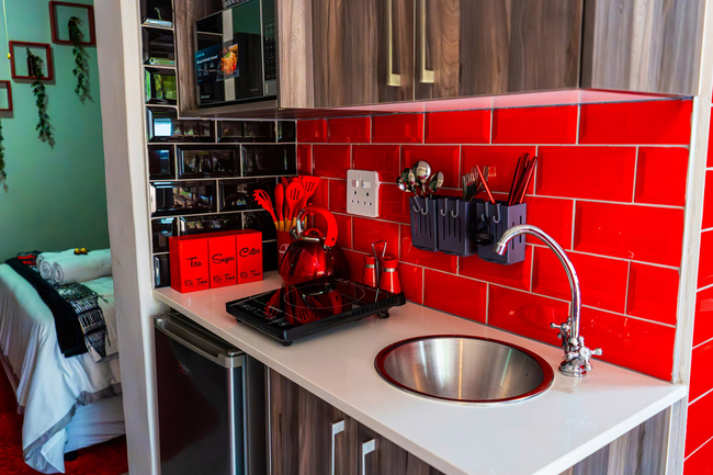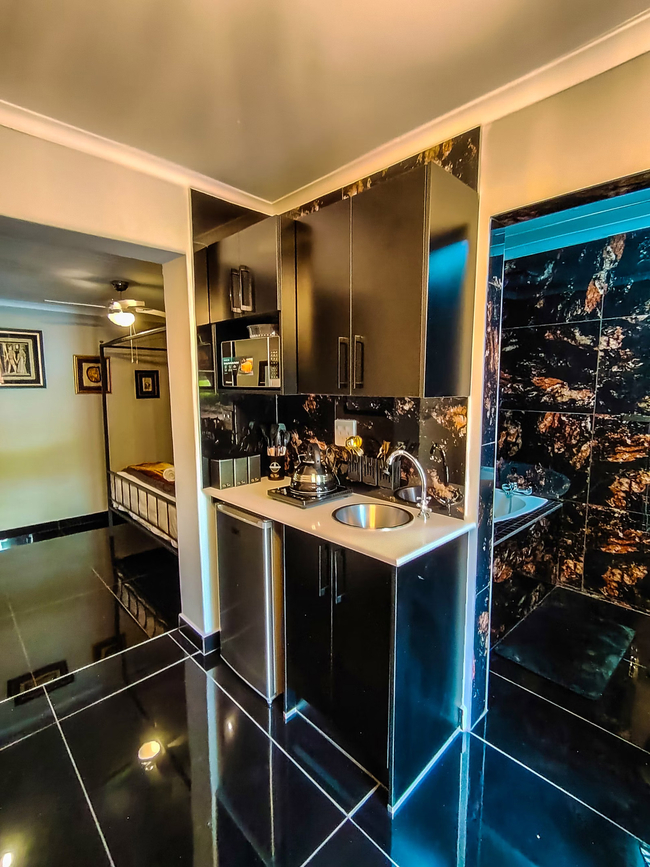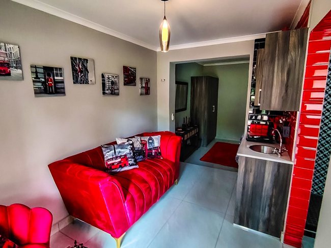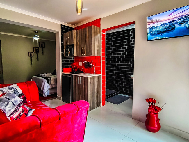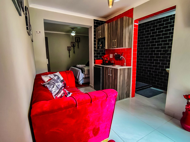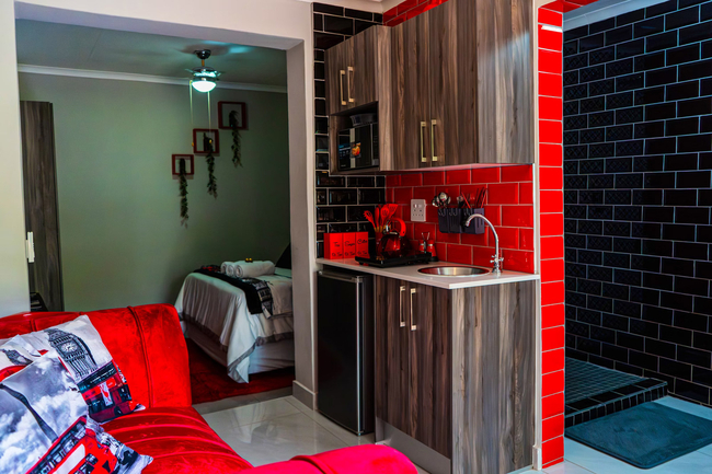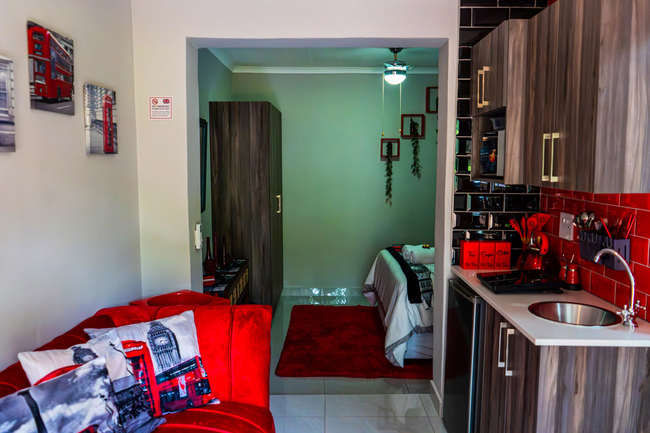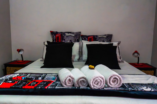 The British Unit is our spacious, beautifully themed self-catering accommodation, showcasing classic British charm and modern comfort. The main bedroom exudes timeless elegance with its British-inspired feature wall and built-in cupboards. It is furnished with a comfortable queen-size bed, side tables, a mirror cabinet, and ample lighting, creating a relaxing and stylish retreat for your stay.The unit features a generous lounge area equipped with a Smart TV for streaming apps such as Netflix, along with Wi-Fi access. The fully fitted kitchenette caters to all your self-catering needs and includes a fridge stocked with milk, jam, and butter, an induction one-plate stove with cooking utensils, a microwave for heating, and complimentary coffee, tea, and sugar. The bathroom offers a shower and toilet, along with a range of toiletries including shampoo, conditioner, shower gel, and towels. For added comfort, the unit is fully air-conditioned, with an additional fan in the main bedroom, and a mobile heater is provided for cooler evenings. Guests will also find an ironing board, iron, and hairdryer in the unit for convenience.