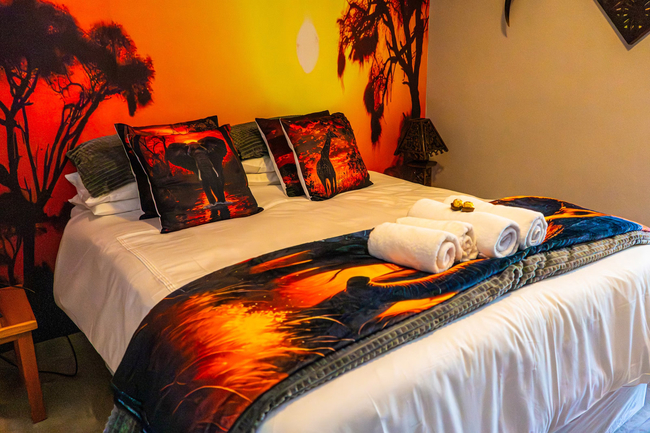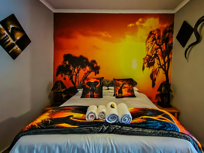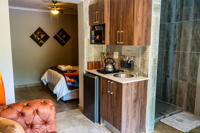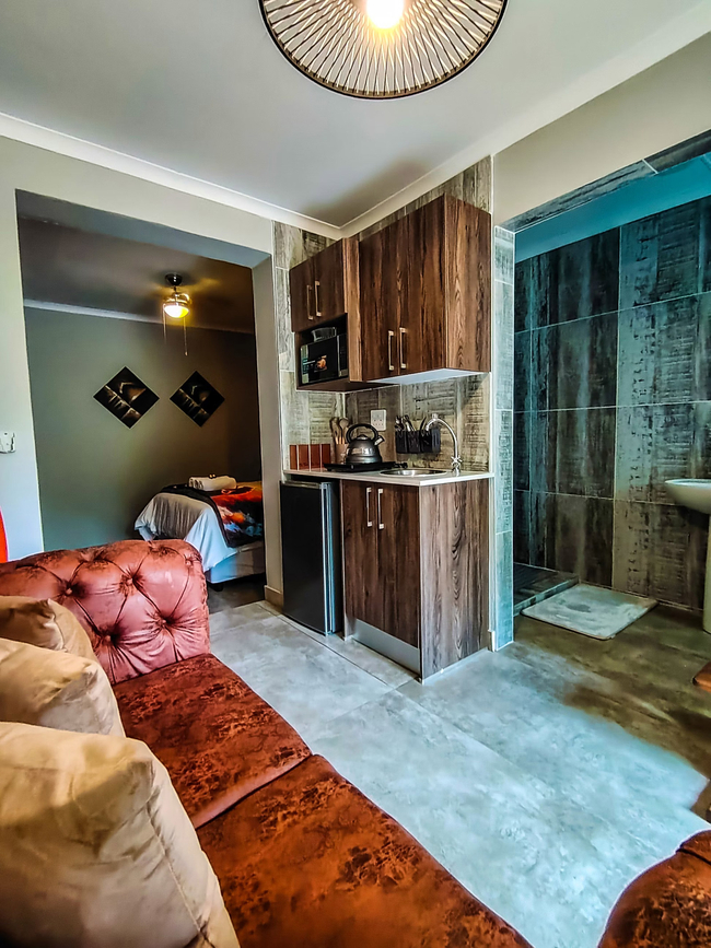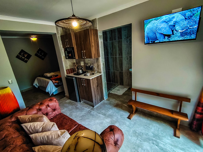 The African Unit is a spacious, comfortably furnished self-catering unit with a subtle African theme. The main bedroom features an African savannah-style mural, built-in cupboards, a queen-size bed, side tables, a mirror cabinet, and good lighting, creating a simple and relaxing atmosphere. It features a lounge area with a Smart TV for apps like Netflix and Wi-Fi access. The fully equipped kitchenette includes a fridge stocked with milk, jam, and butter, an induction one-plate stove with cooking utensils, a microwave for heating, and complimentary coffee, tea, and sugar. The bathroom has a shower and toilet, along with basic toiletries such as shampoo, conditioner, shower gel, and towels. The unit is air-conditioned throughout, with an additional fan in the main bedroom for extra comfort. A mobile heater is provided for cooler evenings, and an ironing board, iron, and hairdryer are available in the unit.