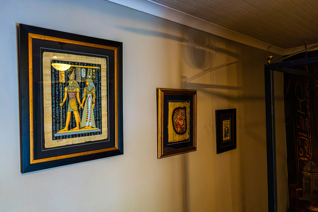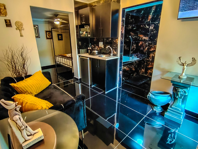 The Egyptian Unit is our largest self-catering suite, offering a comfortable stay with a subtle Egyptian theme. The bedroom includes a built-in cupboard with an Egyptian-style mural, a king-size bed, side tables, a mirror cabinet, and good lighting. A mobile heater, ironing board, iron, and hairdryer are also provided for convenience. The lounge area includes a Smart TV with access to apps like Netflix and free Wi-Fi, which is also available in the surrounding garden. The kitchenette is fully equipped for self-catering and includes a fridge stocked with milk, jam, and butter, an induction one-plate stove with cooking utensils, a microwave for heating, and complimentary coffee, tea, and sugar. The bathroom features a corner bath and toilet, along with basic toiletries such as shampoo, conditioner, shower gel, and towels. The unit has air conditioning throughout, with an extra fan in the main bedroom for additional comfort.
