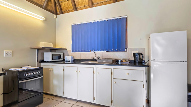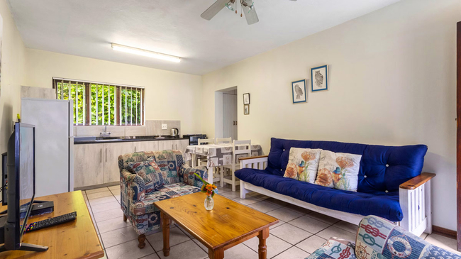 The One-Bedroom Chalet with Bath offers a comfortable and inviting space designed for relaxation and convenience. The bedroom features an en-suite bathroom fitted with a bathtub, while the lounge provides a welcoming sitting area complete with a sleeper couch, ideal for additional guests. A fully equipped kitchen includes a microwave, refrigerator, oven, toaster, bar fridge, and a two-plate stove, making self-catering effortless. Guests can enjoy the comfort of air conditioning and the added safety of an in-room safe. Complimentary Wi-Fi and a TV ensure entertainment and connectivity throughout the stay. Daily cleaning service is provided for convenience. Outdoors, the chalet opens onto a private patio and balcony furnished with seating and a dining area, perfect for relaxing with garden and pool views while enjoying a cup of tea or coffee. This non-smoking unit combines homely comfort with thoughtful amenities, offering an enjoyable and restful stay.