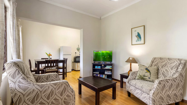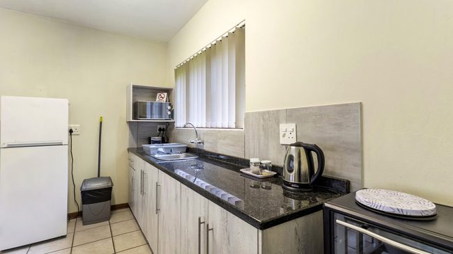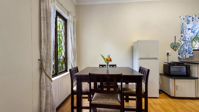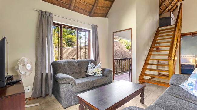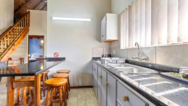 The Two-Bedroom Chalet is a welcoming family retreat offering comfort and space in a relaxed setting. The main bedroom provides a peaceful place to unwind, while the upstairs loft bedroom adds extra room, making it ideal for children. A single bathroom with a shower serves the chalet, and the cosy lounge area offers the perfect spot for families to relax together after a day of exploring. The fully equipped kitchen includes a refrigerator, oven, microwave, toaster, bar fridge, and all the essentials for self-catering convenience. Guests can enjoy modern comforts such as air conditioning, a TV, complimentary Wi-Fi, and a safe, with daily cleaning service ensuring a pleasant and carefree stay. Outdoors, the chalet opens onto a private patio and balcony, complete with outdoor furniture and a dining area. Overlooking the garden and pool, this non-smoking unit combines homely charm with practical amenities, creating an inviting space for memorable family getaways.