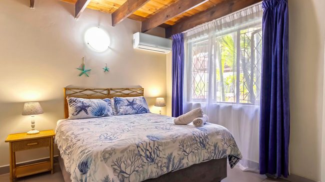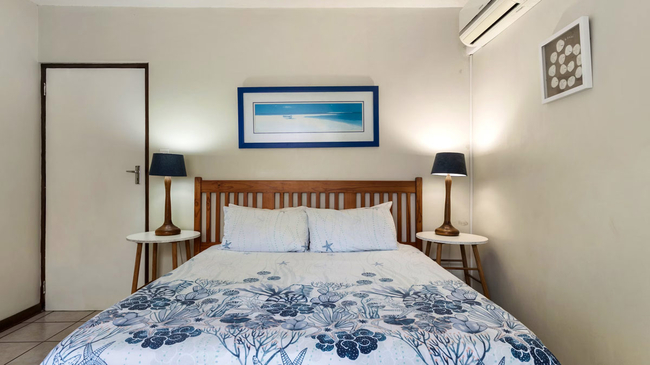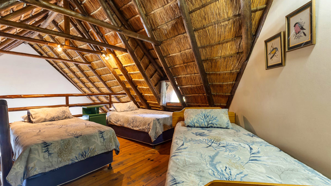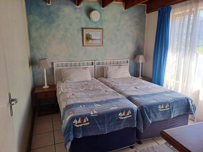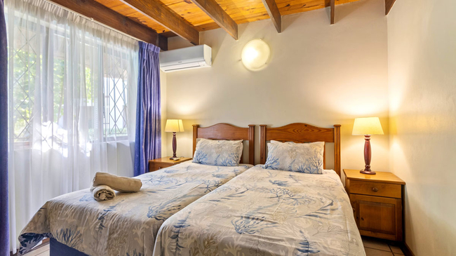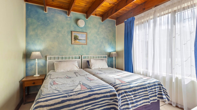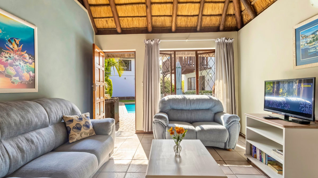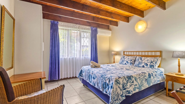 The Three-Bedroom Chalet offers spacious, comfortable accommodation ideal for families or small groups. Located above the garages and accessed by stairs, this duplex-style unit provides a blend of privacy and practicality. The first level features two twin bedrooms, a shared bathroom with a bathtub, a welcoming lounge, and a fully equipped kitchen complete with an oven, microwave, refrigerator, toaster, and bar fridge. Upstairs, the loft area serves as the main bedroom with a queen-size bed and an en-suite bathroom fitted with a shower, creating a private retreat within the chalet. Guests can enjoy thoughtful amenities such as complimentary Wi-Fi, a TV, a secure in-room safe, and a dining area, with regular cleaning service ensuring a comfortable stay. A private balcony offers pleasant garden and pool views, making it an inviting spot for morning coffee or evening relaxation. This non-smoking chalet combines functionality with a warm, homely atmosphere, perfectly suited for relaxed seaside holidays.