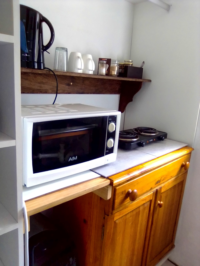The kitchenette is perfectly equipped for preparing light meals and all crockery and cutlery is kept in the beautiful kitchen dresser. A fridge / freezer, microwave, two plate stove, kettle and toaster are also at your disposal.