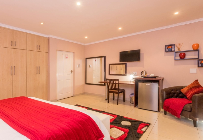 All rooms are furnished with queen size beds, en-suite bathrooms and offer mini fridge, air conditioning, Dstv, hospitality tray and hair dryers. Rooms are serviced daily. Rooms also have a lock up facility for any valuables. The rooms upstairs have access to the balcony. Complimentary Wi-Fi is also available and there is secure off road parking.