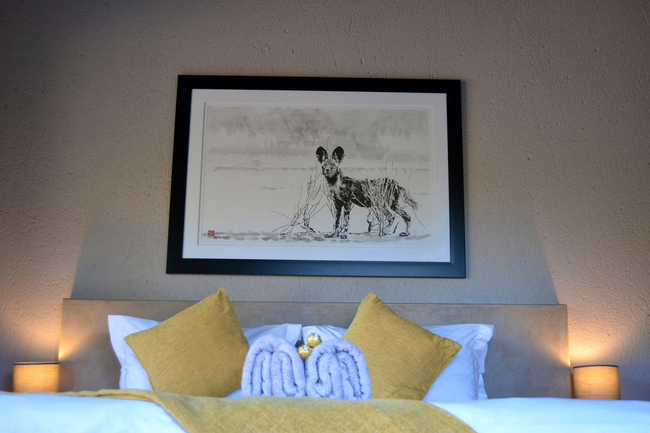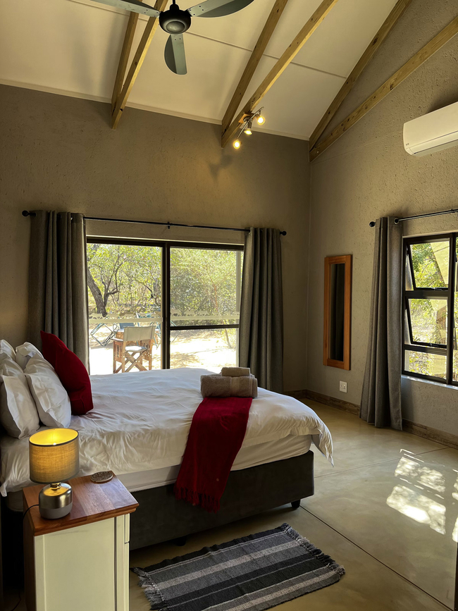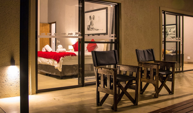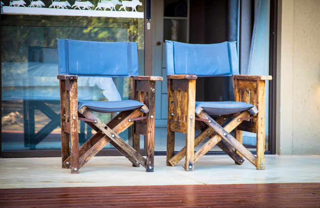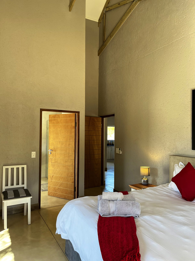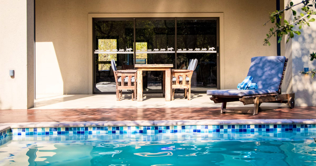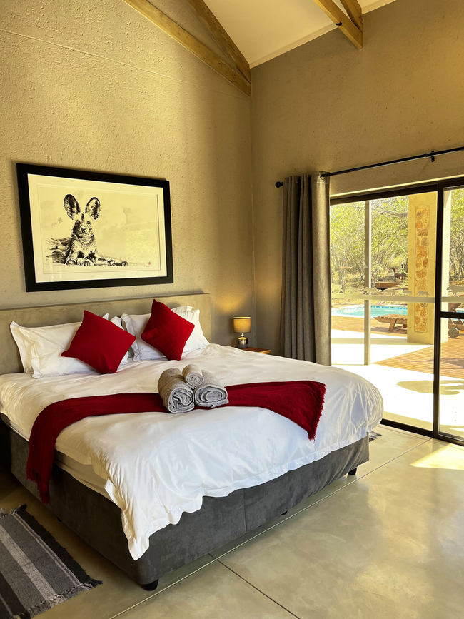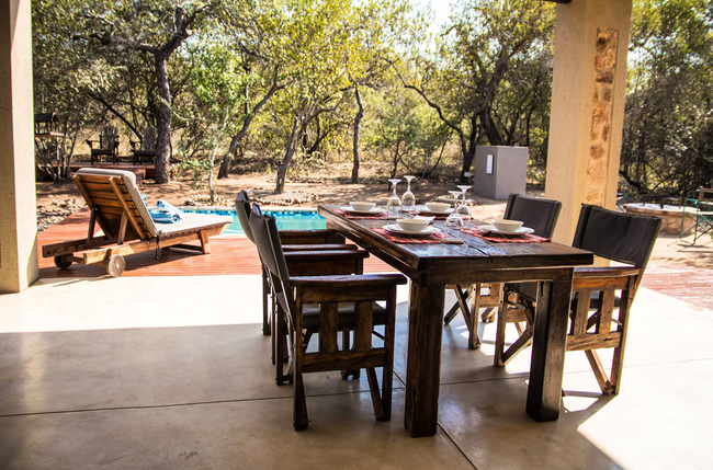 Sliding doors lead onto the patio which has a dining table and chairs. There is a plunge pool to cool off in and a deck with braai facilities from which you can watch wildlife wander by.