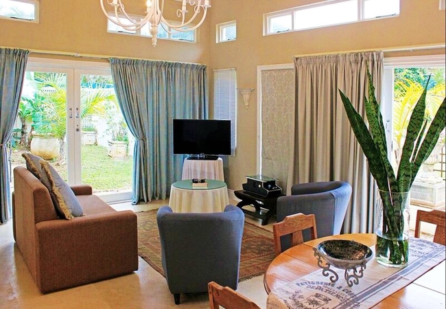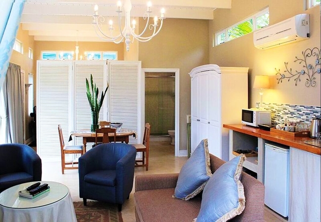 Cottage with a queen size bed and a double sleeper couch for children. En-suite bathroom with shower only. Kitchenette and private BBQ facilities. All suites and rooms offer a bed with pure cotton linen, a private bathroom equipped with a shower, basin, toilet, hand towels, bath towels and other bathroom amenities. Each room also has an air-conditioning unit, ceiling fan, flat screen TV with hotel DStv and satellite channels, bar fridge, tea and coffee making facilities, complimentary Wi-Fi, inside and outside seating areas including a desk area for those on business. Hairdryers, irons and ironing boards are available on request.