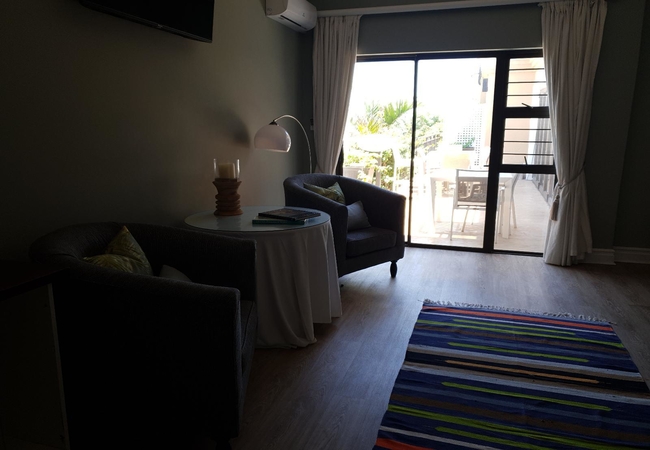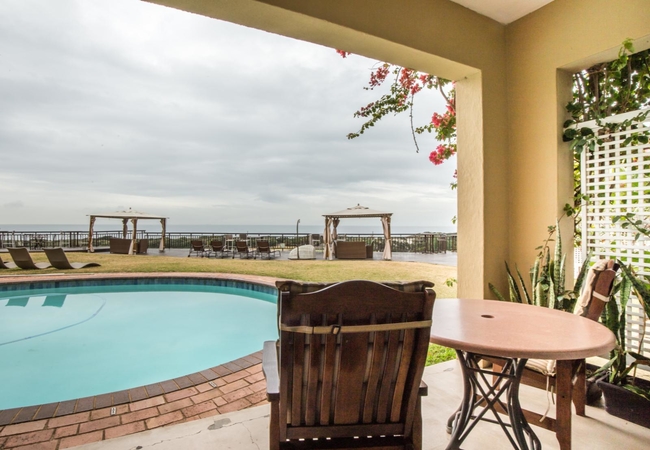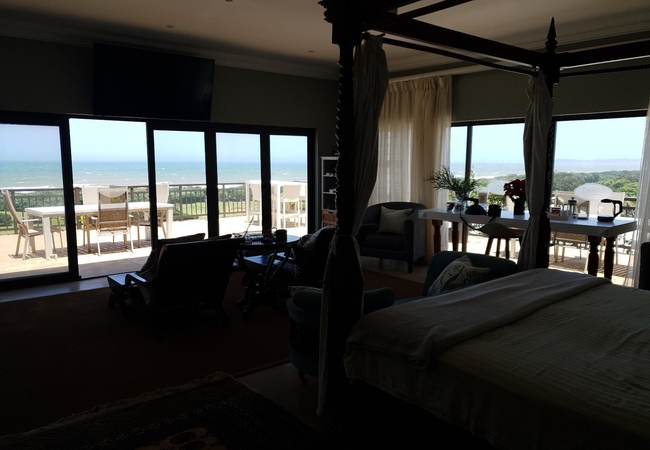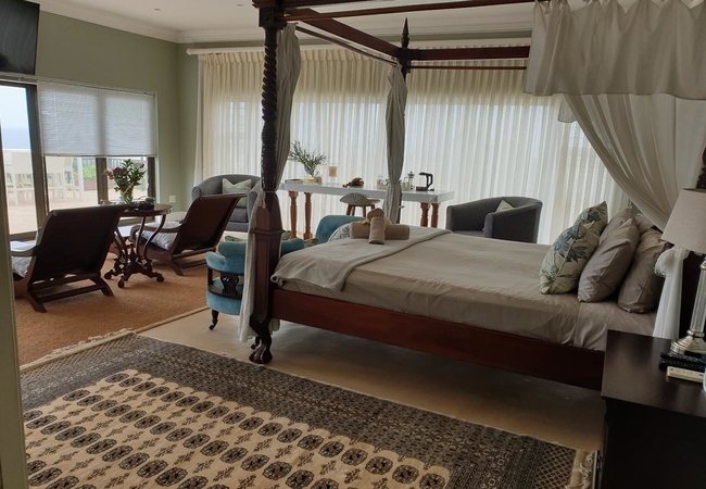 Room with a queen size bed, balcony or patio with sea views. All suites and rooms offer a bed with pure cotton linen, a private bathroom equipped with a shower, basin, toilet, hand towels, bath towels and other bathroom amenities. Each room also has an air-conditioning unit, ceiling fan, flat screen TV with hotel DStv and satellite channels, bar fridge, tea and coffee making facilities, complimentary Wi-Fi, inside and outside seating areas including a desk area for those on business. Hairdryers, irons and ironing boards are available on request.