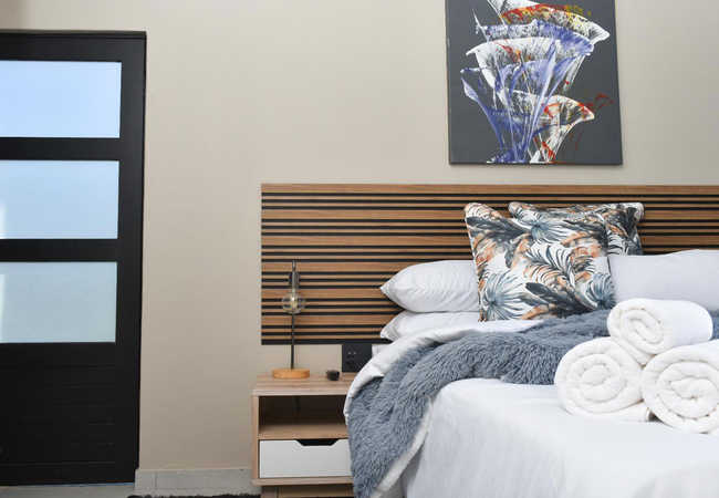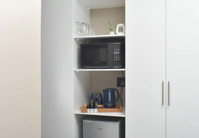 The apartment has one bedroom furnished with a Queen-size bed and two sleeper couches for children and adults. There is one bathroom, a fully equipped kitchen and a lounge which has a TV with streaming services. The suite offers a Queen-size bed and en-suite shower, a TV with streaming services, workstation, tea / coffee facilities, a microwave and bar fridge. Wi-Fi is available in both units.