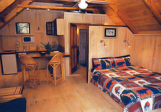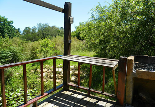 En-suite bedroom and open-plan kitchen/sitting-room leading onto a deck surrounded by trees. The cabins are fully furnished and equipped for self-catering and braai facilities are on the deck. As well as an indoor shower, each cabin has its own outside hot and cold shower.