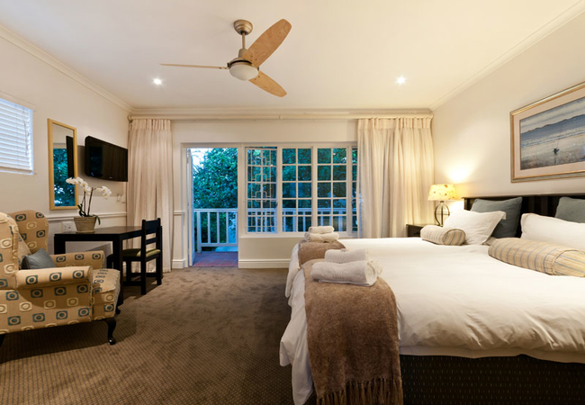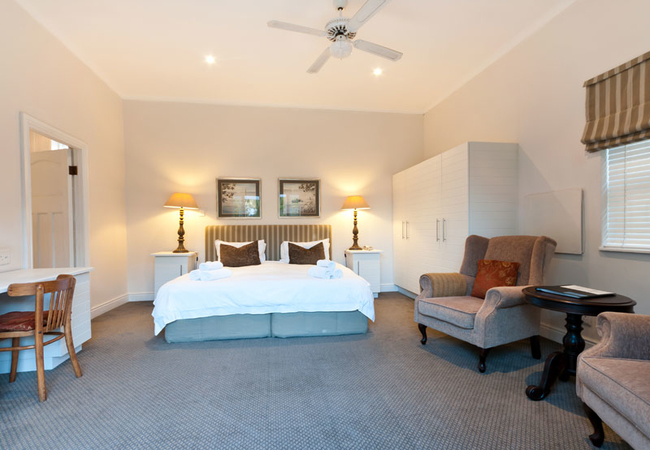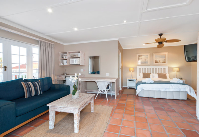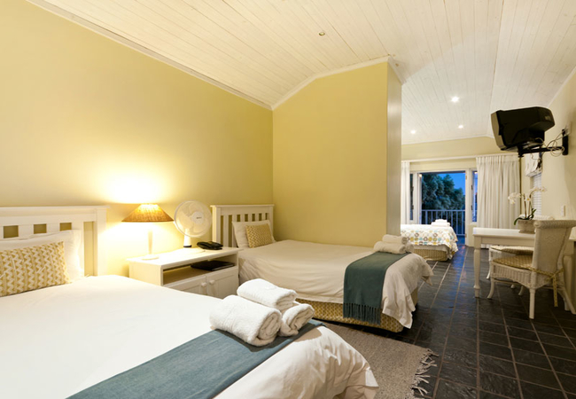 King/Twin beds, en-suite bathroom with bath and shower. Mini kitchenette with bar fridge, microwave, toaster, kettle, cutlery, crockery, glasses and prep bowl. TV with DSTV, free WiFi, telephone, electric fan, heater and a hair dryer.