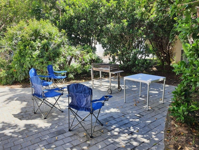 The second bedroom is also furnished with a Queen-size bed and includes a private en-suite bathroom. The third bedroom contains two three-quarter beds and has its own en-suite as well. Every bedroom is fitted with a ceiling fan and opens to the outdoors through sliding glass doors, allowing natural light and fresh air to flow in.