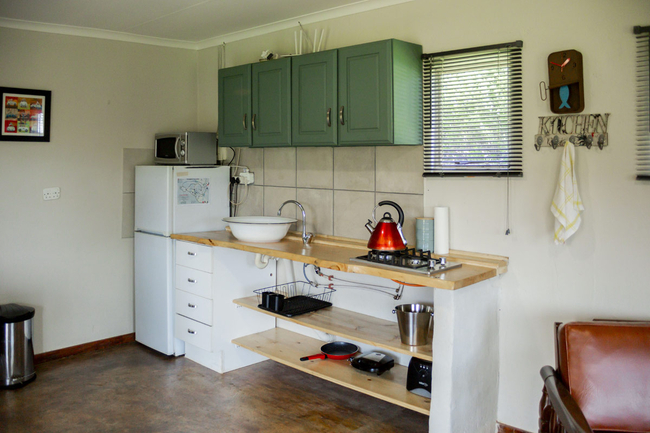 The kitchen is well-equipped with a microwave, kettle, fridge, stove, oven and toaster. The patio of Fly Inn Cottage overlooks the Steenberg Mountains, and guests can expect a visit from the donkeys and roaming sheep.