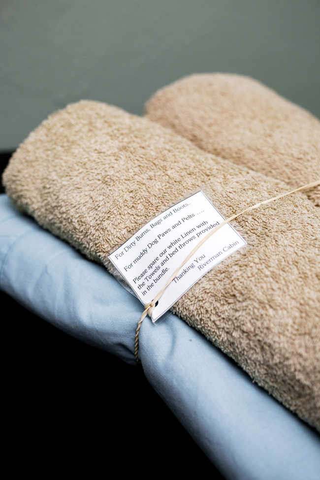 The cabin is furnished with a double bed and has an en-suite bathroom fitted with a shower and a toilet. There is an additional sleeper couch in the living area close to the fireplace.