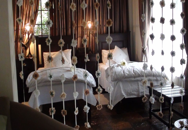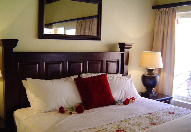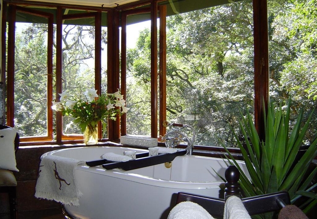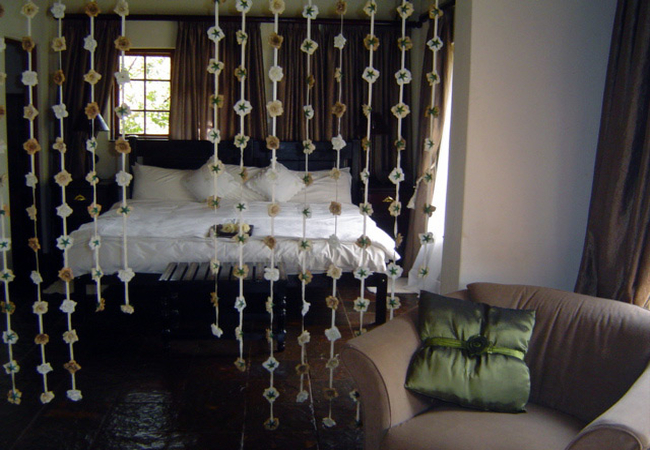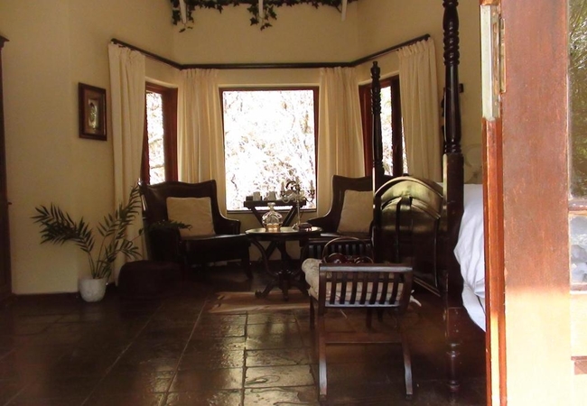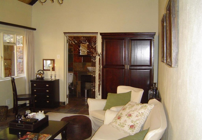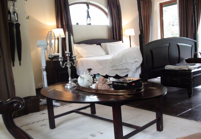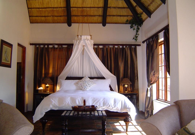 Named after the Cinnamon Dove, the Cinnamon Room is set in a secluded spot in the bush away from the main lodge and is totally private. This suite is furnished with a Queen-size Four-Poster bed and has its own veranda, outdoor stone shower, Ball and claw bath tub set in the bay window looking into the bush. DSTV, totally private. Fan, Electric blanket and heater, snuggle under our percale cotton duvets and linen. (Note: if you are allergic to down feathers, we can supply fiber duvets and pillows)