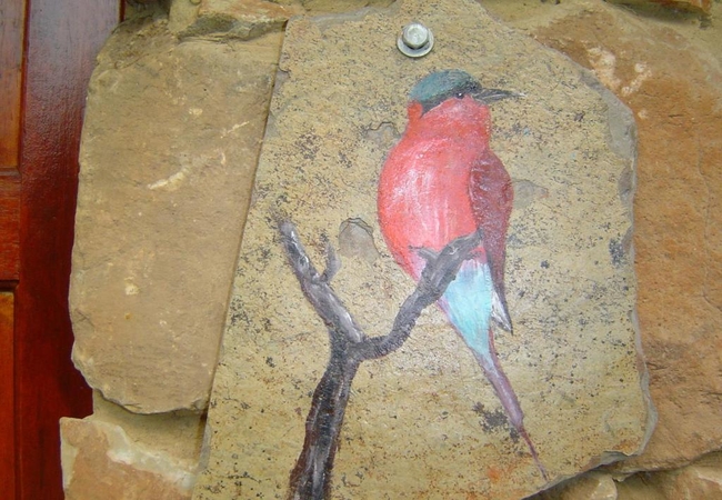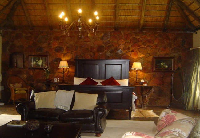 Named after the Carmine Bee Eater, the spacious Carmine Suite supports a fireplace, TV with DSTV, his and her outdoor stone showers, veranda, huge bath tub for two with lots of romantic candles. The room is furnished with an extra-length King-size bed. Fan, Electric blanket and heater, snuggle under our percale cotton duvets and linen. (Note: if you are allergic to down feathers, we can supply fiber duvets and pillows)