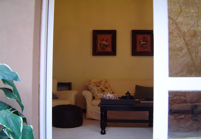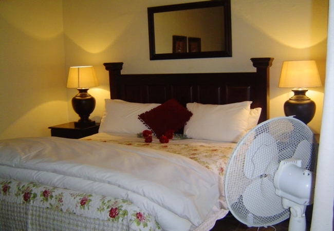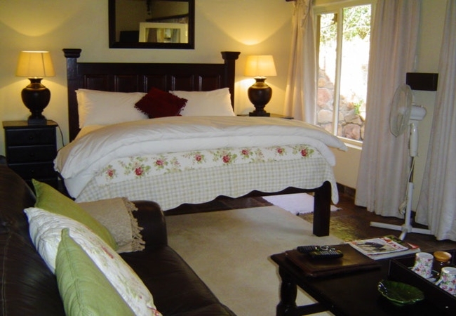 Named after the Swainson Francolin (Spur Fowl), the Swainson Suite is a romantic suite which has a big corner bath with shower, and TV with DSTV. This room is furnished with a King-size bed, or can be converted into two single beds, on request. Fan, Electric blanket and heater, snuggle under our percale cotton duvets and linen. (Note: if you are allergic to down feathers, we can supply fiber duvets and pillows.)