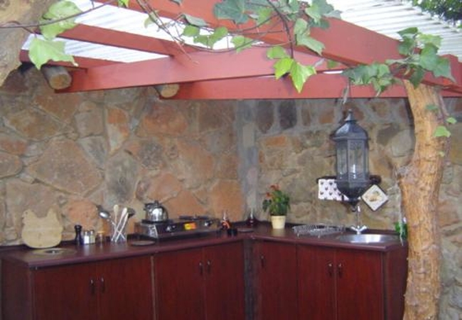 This Self-catering unit is the ultimate in luxury and out-door living; it supports a Braai, Fridge, Microwave oven, gas 2 plate stove, and is fully equipped, has a fireplace, DSTV, his and her outdoor stone shower, veranda, it's own private garden, huge bath tub for two with lots of romantic candles, King sized extra length bed. Fan, Electric blanket Bar fridge and heater, snuggle under our percale cotton duvets and linen. (Note: if you are allergic to down feathers, we can supply fiber duvets and pillows) We supply Fire wood and charcoal.