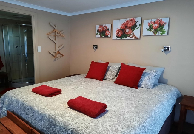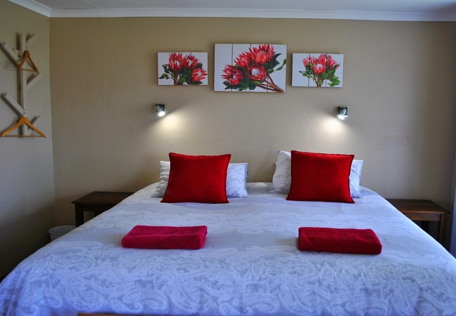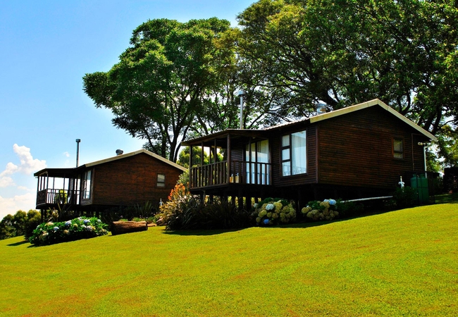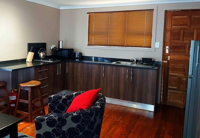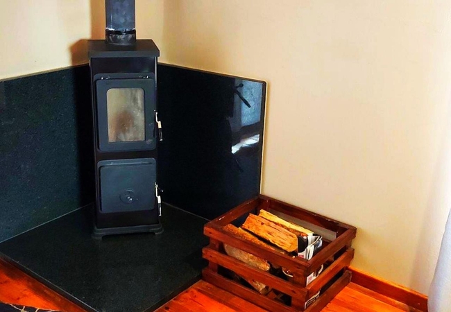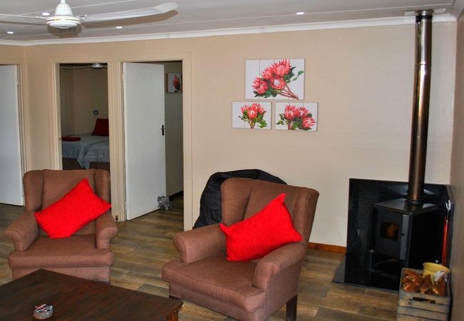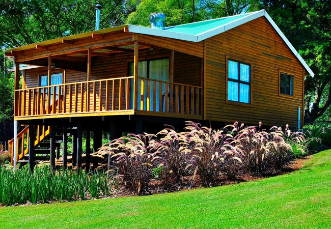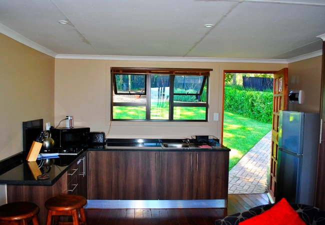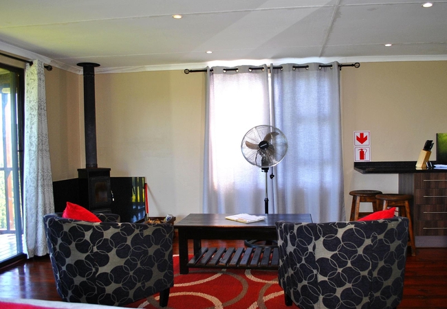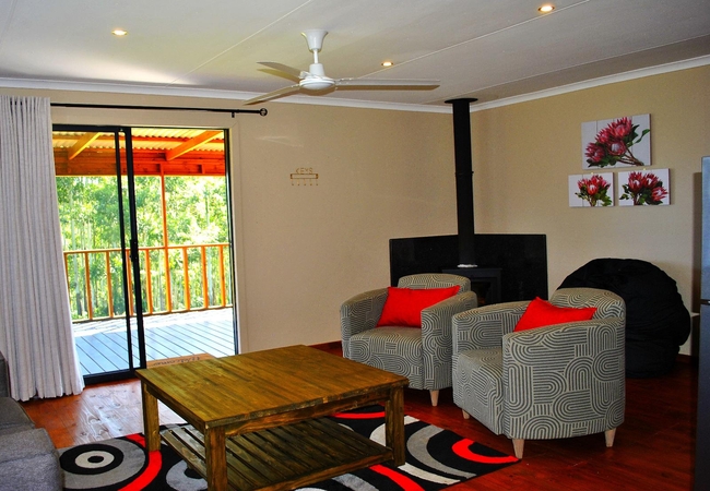 This cabin includes a King-size bed or twin beds; a bathroom with a shower, toilet and a basin. There is an open-plan kitchen / living area with an indoor fireplace and a fully equipped kitchenette with fridge, 2 plate gas stove, kettle, microwave and a toaster. There is also a covered deck, BBQ / braai facilities and FREE Wi-Fi.