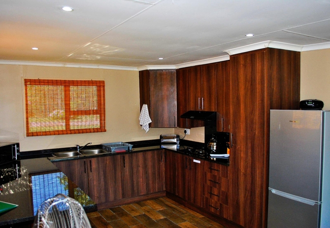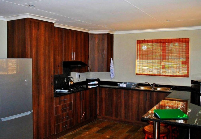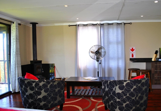 The cabin has two bedrooms and a big double sleeper couch in the lounge, comfortably sleeping six people. One bedroom is furnished with a King-size bed and the other has two single beds. The bathroom has a shower only. There is a fully fitted kitchen with a fridge and four plate gas stove. Braai facilities are provided under the trees. Each cabin also provides a spacious, covered deck, with spectacular views.
